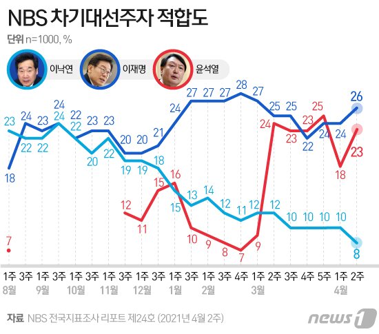 한국사회여론연구소 (ksoi)가 tbs 의뢰로 지난 5일 전국 성인 남녀 1023명을 대상으로 조사를 실시해 이날 공개한 차기 대선 대서. 쿠키뉴스 의뢰로 여론조사전문기관 한길리서치가 지난 5일부터 7일까지 전국 만 18세 이상 남녀 1002명을 대상으로 차기대선주자 선호도를 조사한 결과, 윤석열 총장의 지지율은 28.2%, 이재명 지사 21.3%, 이낙연 대표 18.0% 순으로 나타났다.